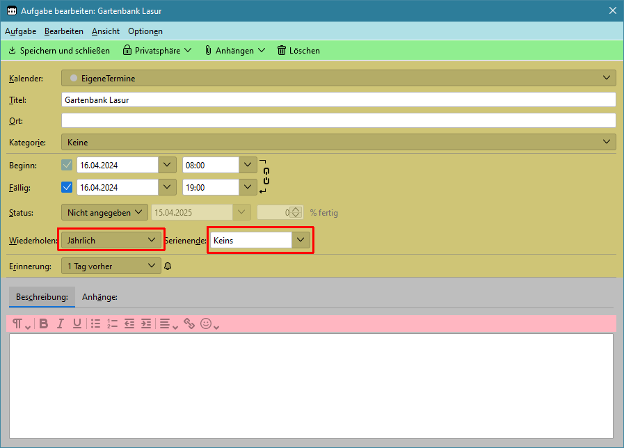 Dann wechselt in der Aufgabenliste der entsprechende Eintrag von oben (rot) nach unten (schwarz) und wird dort für das kommende Jahr angezeigt. Ein Geburtstag am 10.04.2024 sollte nun nach Erledigung neu angezeigt werden für den 10.04.2025. So war das bisher. Neuerdings weist der neue Eintrag aber das Fälligkeitsdatum 10.04.2026 aus. Ich muß jeden neuen Eintrag kontrollieren und muß das Fälligkeitsdatum berichtigen.