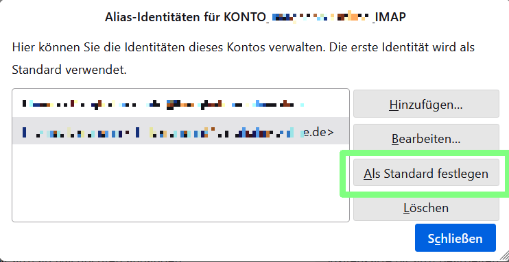 ich möchte, dass beim Versenden von Mails ein Alias meines Kontos voreingestellt ist. Geht das? In den Einstellungen bei "Standardidentität" steht meine (hässliche) Default-Adresse beim Provider, und die nimmt TB natürlich zuerst. Die kann ich da doch nicht ändern, oder?