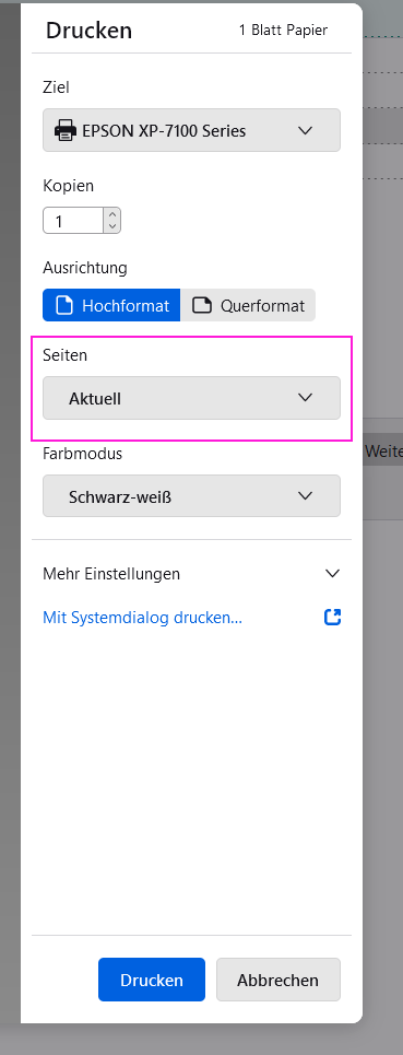 Druckvorschau immer bei Seitenanzahl "Aktuell" automatisch voreingestellt ist an stelle von "Allw" ?