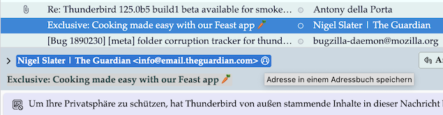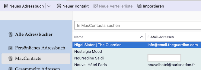 Der einzige Schönheitsfehler dabei ist, dass die Synchronisation bei auf diese Weise im CardDav Adressbuch gespeicherten Kontakten nicht im Sinne von Thunderbird CardDav AB > Richtung macOS Kontakte funktioniert. Genau so wenig wie bei manuell im TB CardDav Adressbuch erstellten Adressen