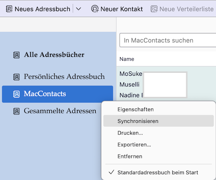 In meinem Beispiel wurde der neue Kontakt im Adressbuch "MacContacts" gespeichert, welches nichts anderes als das von mir in TB erstellte CardDav-Adressbuch für die macOS "Kontakte" ist