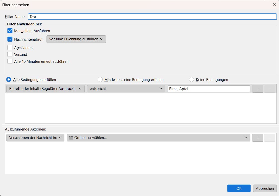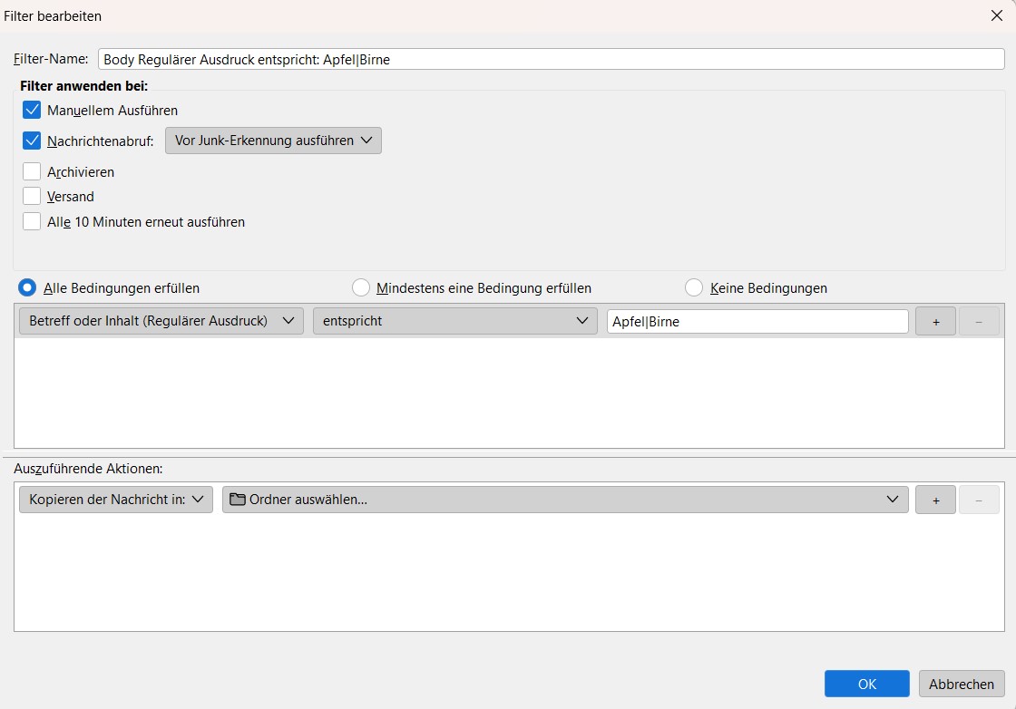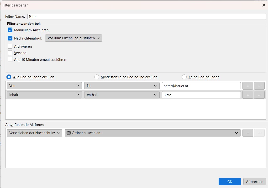 Wenn Mail von peter@bauer.at ist und wenn im Inhalt das Wort Birne oder Apfel oder Ananas oder Banane (Und viele viele andere Obstsorten) vorkommt, dann verschiebe die Nachricht in den Ordner „Peter Obst“