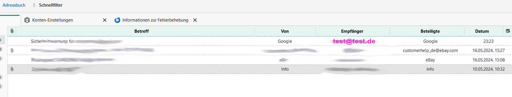 wenn der "Empfänger" (test@test,de) als eMail angezeigt wird