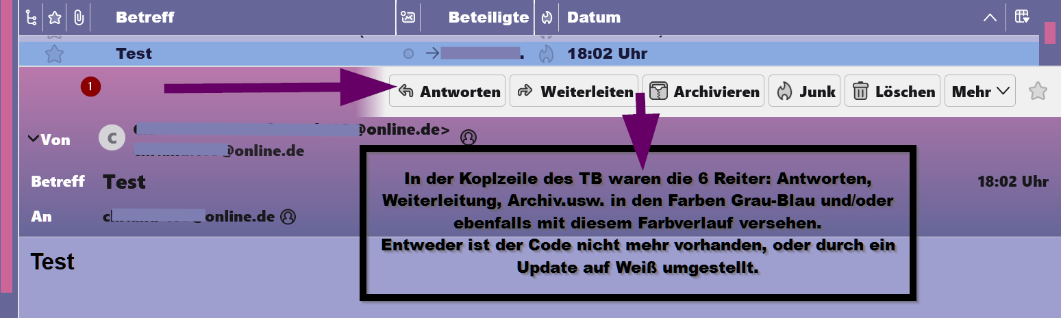 Wie im 1. Bild zu sehen ist, sind in der Kopfzeile die 6 Reiter/Button: Antworten, Weiterleitung usw. plötzlich weiß statt graublau.
