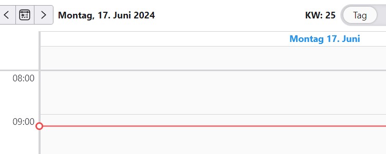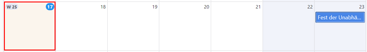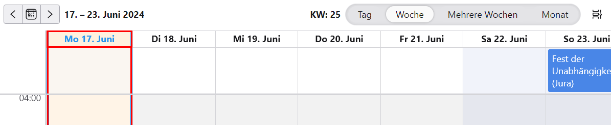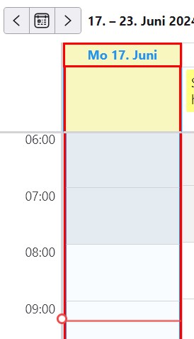 In der Täglichen Ansicht (Bild nachfolgend), z.B. Montag 17. Juni, hier könnte der Hintergrund des "Heutiger Tag" ein klein wenig stärker in Gelb (wie Monat/Woche) hinterlegt sein, wenn der Tag "Heutiger Tag" einzeln angezeigt wird. Ist die noch möglich?