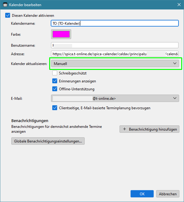 stelle mit Doppelklick auf einen Kalender in der Liste links, auf manuelle Aktualisierung um.
