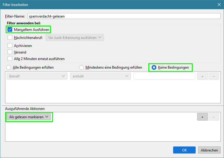 • Nur nichtfefilterte SPAM auromatisch als gelesen markieren (und als Junk/SPAM)