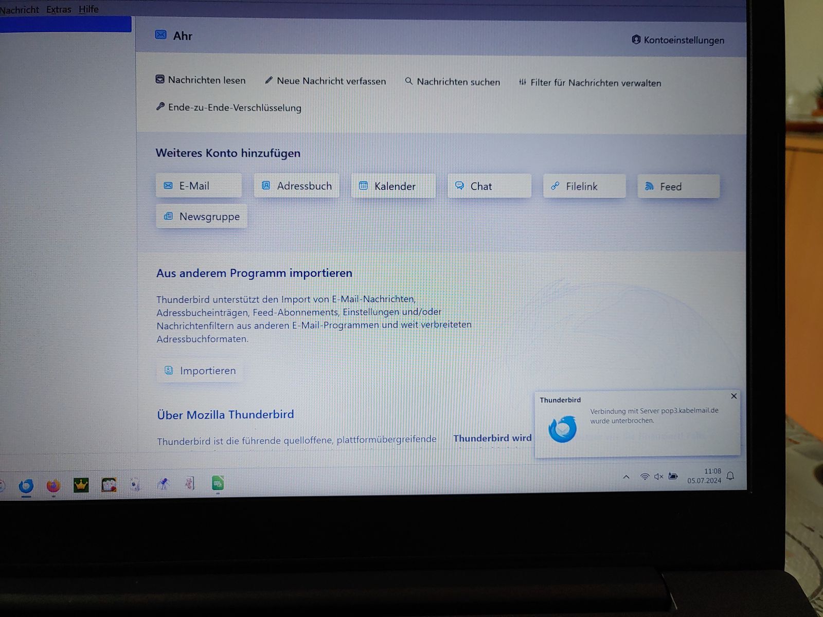 Ich habe seit dieser Woche Probleme mit dem Empfang von über "pop3 " gesendeten Mails auf meinem Notebook im Mailprogramm von Thunderbird. Nach einigem sporadischem Eingang der Mails ging dann gar nichts mehr.