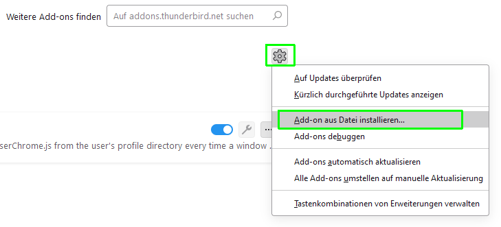 TB starten, Add-ons Verwaltung öffnen. Wie im Bild klicken und zur Add-On Installationsdatei navigieren.