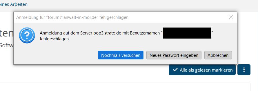 Wenn ich das Paßwort eingebe, bleibt die Fehlermeldung erhalten. Das Abrufen dauert entsprechend lange.
