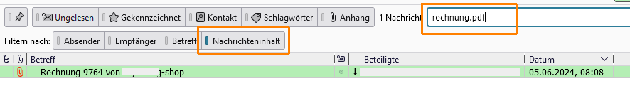 Wenn ich in der globalen Suche in meinem Posteingang nach "Beitragsordnung" suche, finde ich die Mails mit der Einladung/dem Protokoll der Jahreshauptversammlung, bei der der Name des PDF-Anhangs das Wort "Beitragsordnung" enthält.