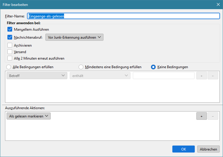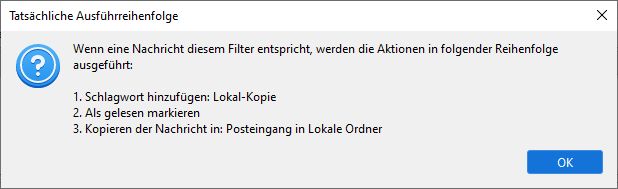 Ich lasse per Filter im IMAP-Konto eingehende Nachrichten in meinen lokalen Ordner kopieren. Mein Wunsch wäre es, dass die im IMAP-Konto verbleibende Nachricht (Original) als gelesen markiert wird, die Kopie-Nachricht im Lokalen Ordner jedoch ungelesen sein soll. Die "Auszuführenden Aktionen" des Filters sehen bei mir so aus (Screenshots sind aus Thunderbird):
