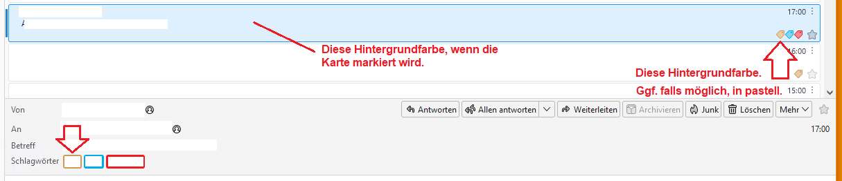 Dieses Farb-Konzept würde ich gerne so ähnlich auf die Kartenansicht übertragen. In der Kartenansicht muss der Text erst einmal nicht gefärbt werden. Dafür sind ja die Label da und wenn mann die im Bedarfsfall ent-stacken kann, reicht mir das vorläufig. Aber mir fehlt die Hintergrundfärbung der markierten Mail-Kachel in der Farbe des Labels.
