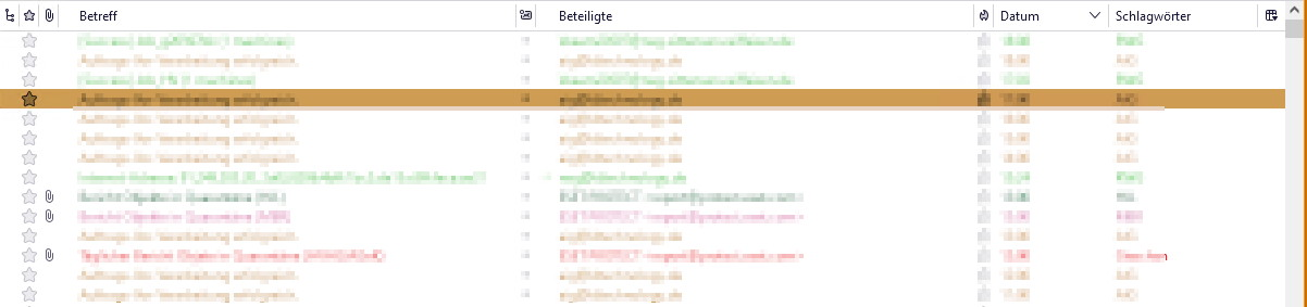 Da wird entsprechend dem Schlagwort der Text eingefärbt, wenn die Zeile nicht markiert ist. In meinem Use-Case ist immer nur ein Schlagwort pro Mail zugewiesen. Insofern ist die Farbgebung eindeutig. Markiert man eine Zeile, wählt Thunderbird zum Hervorheben der Zeile nach einem nicht so ganz genau bekannten Verfahren als Hintergrundfarbe der Zeile die Farbe des Schlagwortes und setzt den Text dazu passend für genügend Kontrast entweder schwarz oder weiß, je nach dem, wie hell oder dunkel die Schlagwortfarbe angelegt ist.