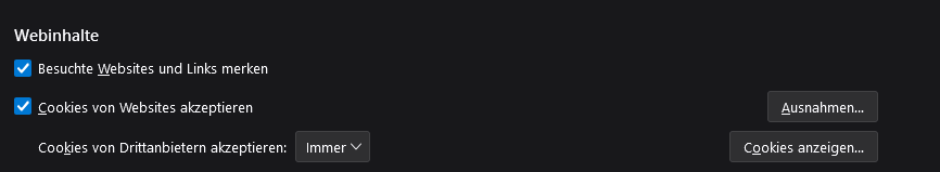 Bei Chrome lässt sich da ja gar nichts einstellen (nur für Drittanbieter). Ich habe auch Edge und Firefox (neu installiert und nichts geändert) probiert.- Ändert nichts.