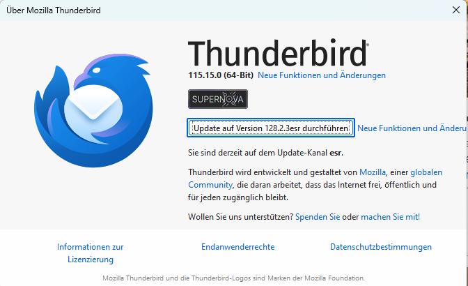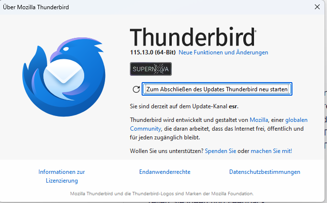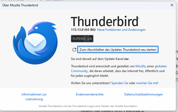 Durch Zufall bin ich nun noch einmal auf die Updatefunktion gegangen und sehe, dass Thunderbird jetzt plötzlich dazu auffordert zum Abschließen des Updates das Programm neu zu starten. Wie gesagt, das funktioniert jetzt nicht mehr, auch wenn man das mehrfach wiederholt.