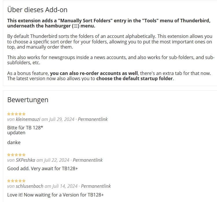 AddOn "Manually sort folders" nicht kompatibel mit TB 128.0.1