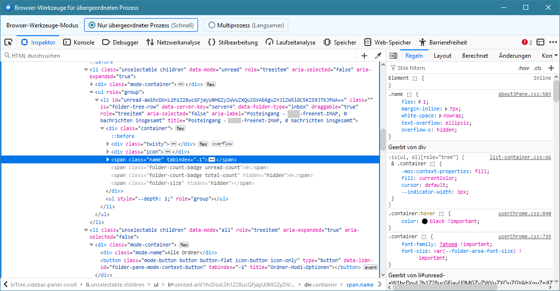 Könntest Du mal mit meinem CSS eine Situation nachbilden, wo der ungelesene Ordner nicht ausgeblendet wird und das mit dem Entwickler-Werkzeugkasten inspizieren und von denen passende Screenshots machen? Irgendwie muss man dem ganzen Spuk doch auf die Spur kommen können.