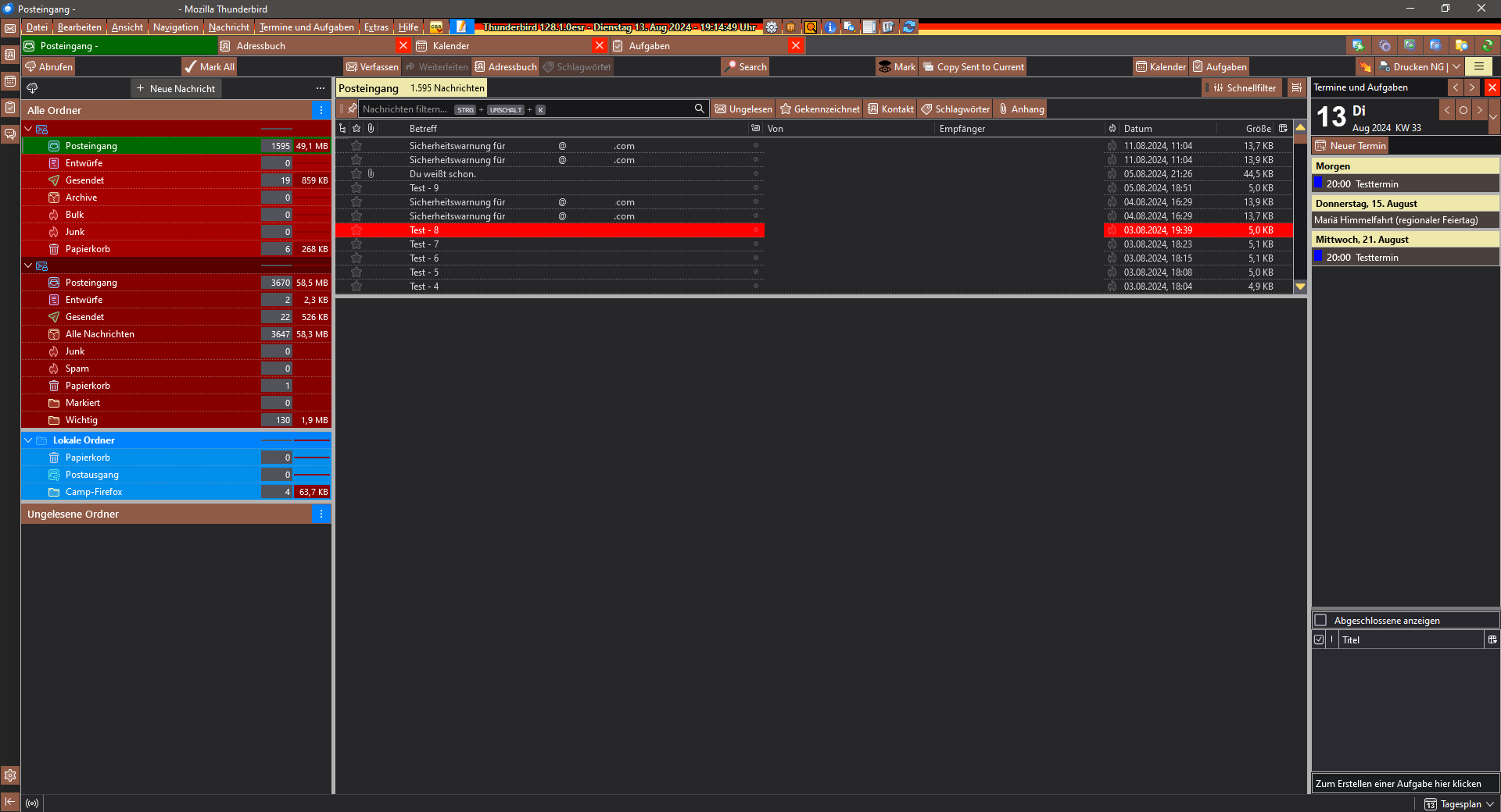seitdem mein Thunderbird auf Version 128.1 umgestiegen ist, sind bei mir die E-mails der letzten 13 Monate nicht mehr lesbar (weißer Bildschirm wo sonst der Nachrichteninhalt stehen sollte). Seit ca. 2 Tagen werden die neu reinkommenden E-Mails wieder richtig dargestellt. Dieses Phänomen wurde schon häufiger hier in den Foren besprochen, die dort angegebenen Lösungen funktionieren bei mir allerdings nicht. Zu meinen bisherigen Lösungversuchen gehören: