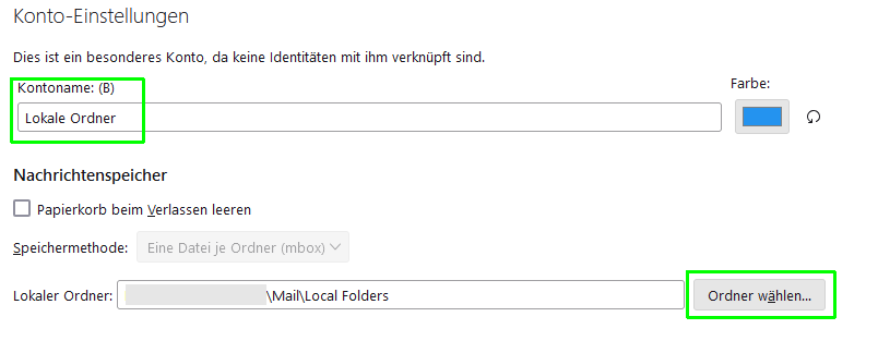 Extras -> Konten-Einstellungen links auf "Lokale Ordner" klicken -> rechts korrekten Namen vorgeben (falls fehlerhaft)