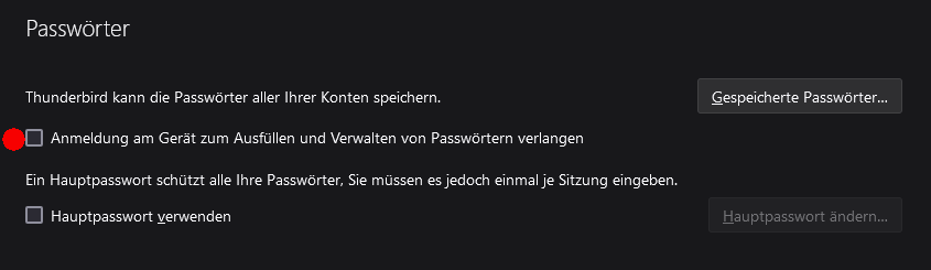 Ich möchte eigentlich nur den Zugriff auf meine Passwörter unter Einstellungen > Sicherheit > gespeicherte Passwörter mit einem Masterpasswort schützen. Aber das Masterpasswort, das ich dort vergeben kann schützt das Öffnen von Thunderbird. Gibt es die von mir gesuchte Möglichkeit, vielleicht als Addon?