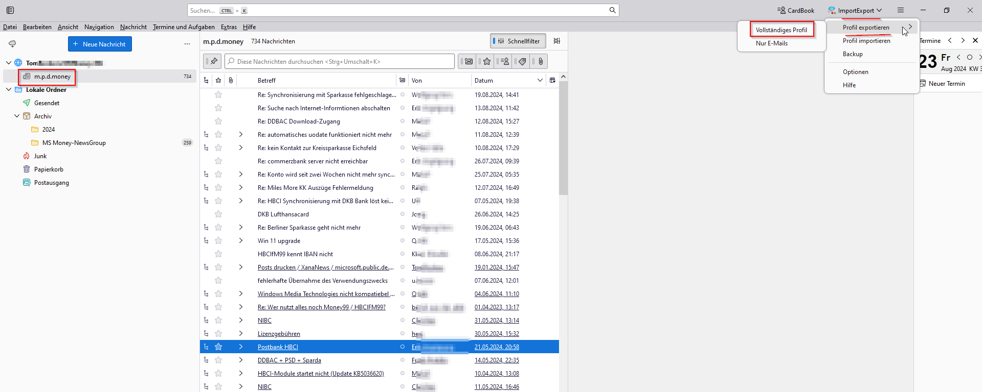 AdOns: Cardbook, Import/Export, Später senden, Markieren