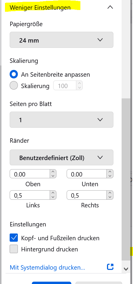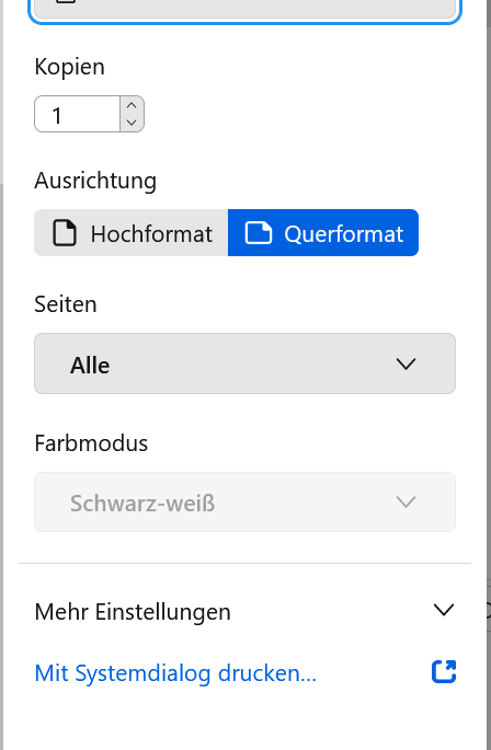 Im Druckdialog hast du eine unscheinbare Stelle mit 'Mehr Einstellungen'.
