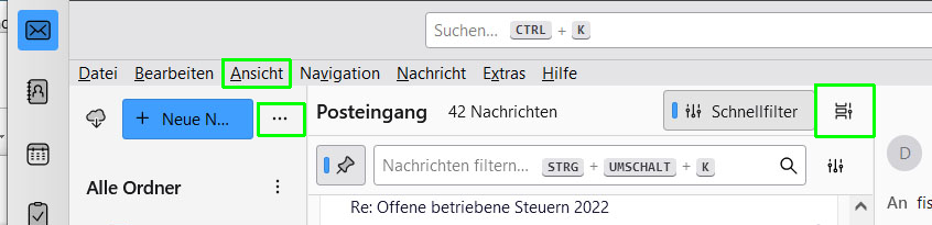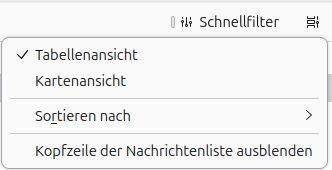 Mit (oder nach) dieser Integration durch swisscom sieht auch mein TB anders aus. Besonders der Posteingang, der früher in übersichtlicher Baumdarstellung mit Spalten für die Detailinfos zu Mails war (jetzt sind es nur noch Schaltfelder zum Aufrufen des Inhalts). Es fehlt die Funktion, mit der ich im Menü die Eingänge nach Absendern, Datum usw. sortieren konnte.