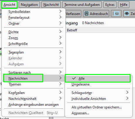 dabei mußt ich einen Klick irgendwo zu viel gemacht haben - nun werden alle Nachrichten (weder Eingang noch Ausgang noch Entwürfe) nicht mehr angezeigt; (nur weiße Fläche)