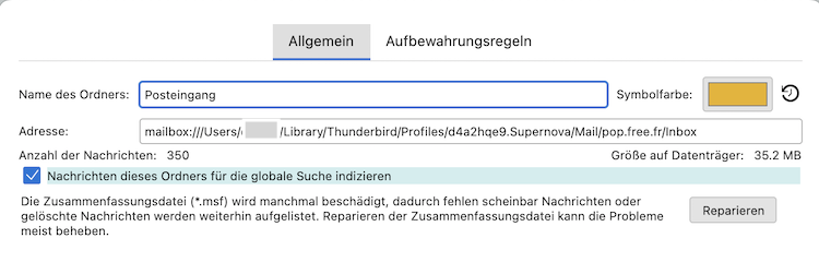 Wenn du einen Rechts-Klick > Eigenschafen auf den Ordner Posteingang machst, sollte sich ein kleines Fensterchen öffnen wie das folgende ↴