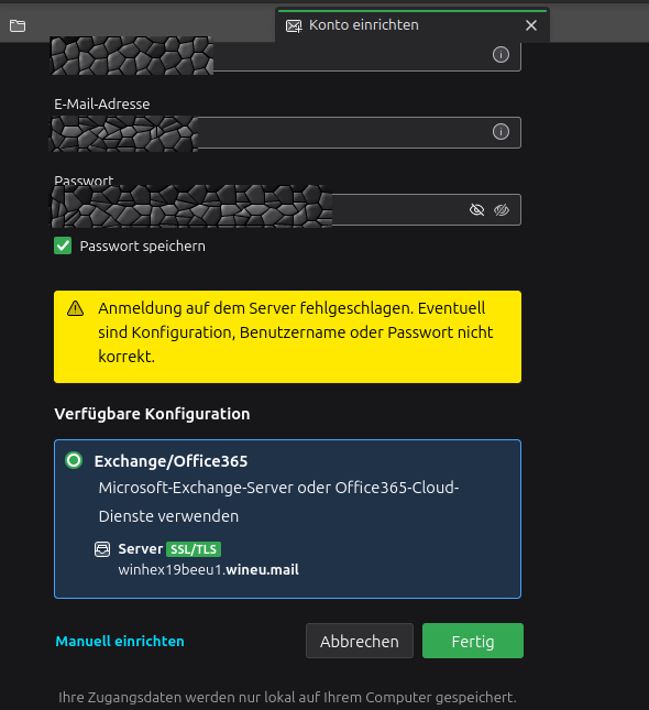 Ich versuche Thunderbird nach einer kompletten Neuinstallation wieder mit einem Exchange Server von Ionos zu verbinden.