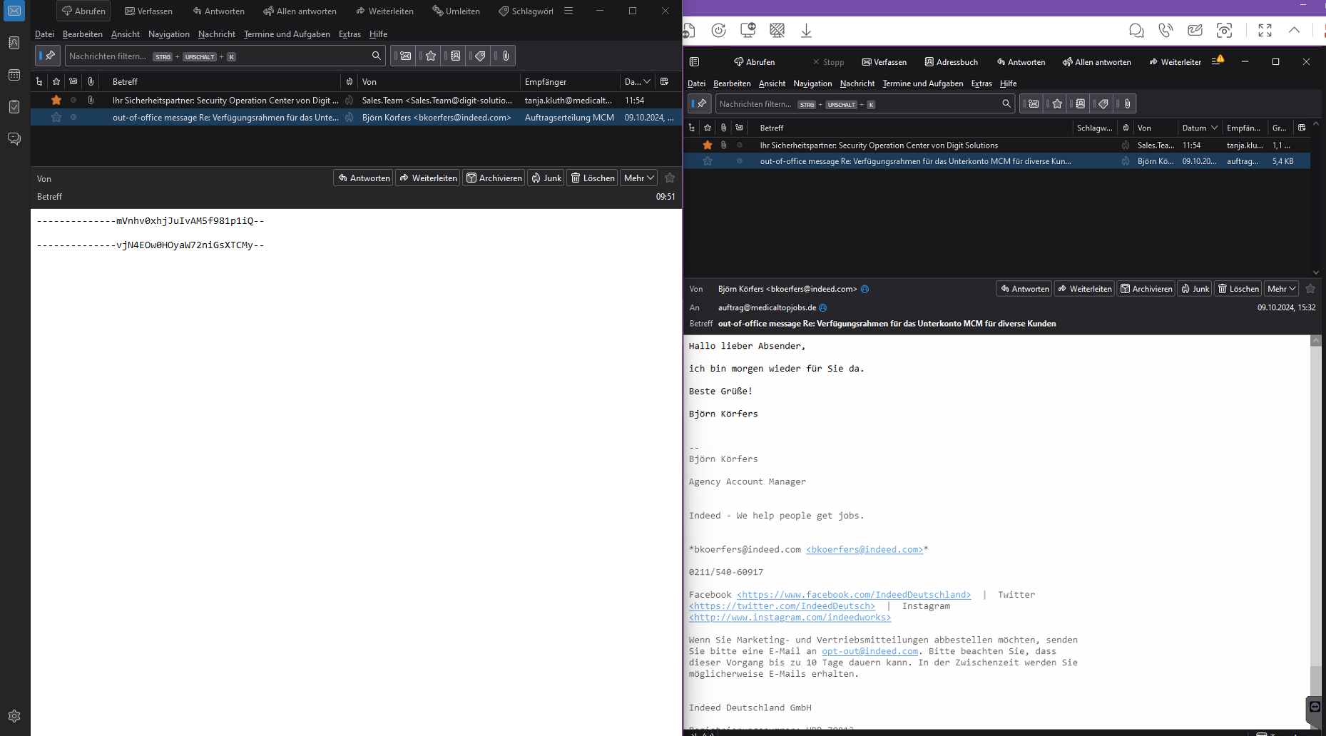 Ich hab Emails gelöscht und in einen komplett anderen Ordner verschoben, bis auf 2 - 3 Email. Lustig: die Email die es seit heute morgen betroffen hat, war dann auf einmal ok. Eine andere Email die bis heute nicht betroffen war (aber auch relativ unwichtig ist) ist statt dessen jetzt defekt und ich kann machen was ich will, sie ist nicht mehr bei mir in Ordnung zu bringen, aber remote auf dem Backup PC (Win7, Thunderbird 128.3.0er) ist sie normal lesbar.