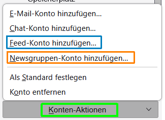 Zweiter Nachtrag: Über Datei > Neu > Feed-Konto... habe ich versucht, einen neuen Feed einzurichten. Auch dabei verschwindet der Eintrag für Feed-Konto wieder. Aber dafür habe ich jetzt einen zusätzlichen Eintrag in der Ordnerliste und weiß nicht, wie ich ihn wieder löschen kann. Im Kontextmenü und unter Konto-Einstellungen finde ich jedenfalls kein Kommando zum Löschen.