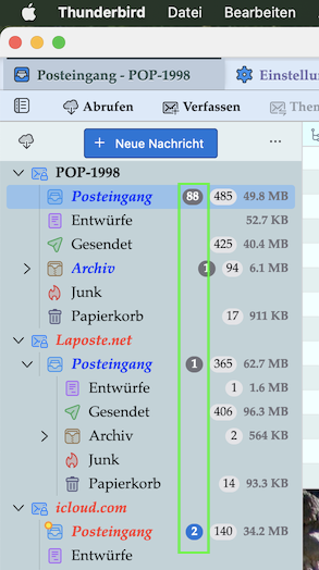 Man kann die Zahl der ungelesenen Nachrichten in den jeweiligen Ordnern (samt Unterordnern) ganz einfach in der Konten/Ordnerliste anzeigen lassen.