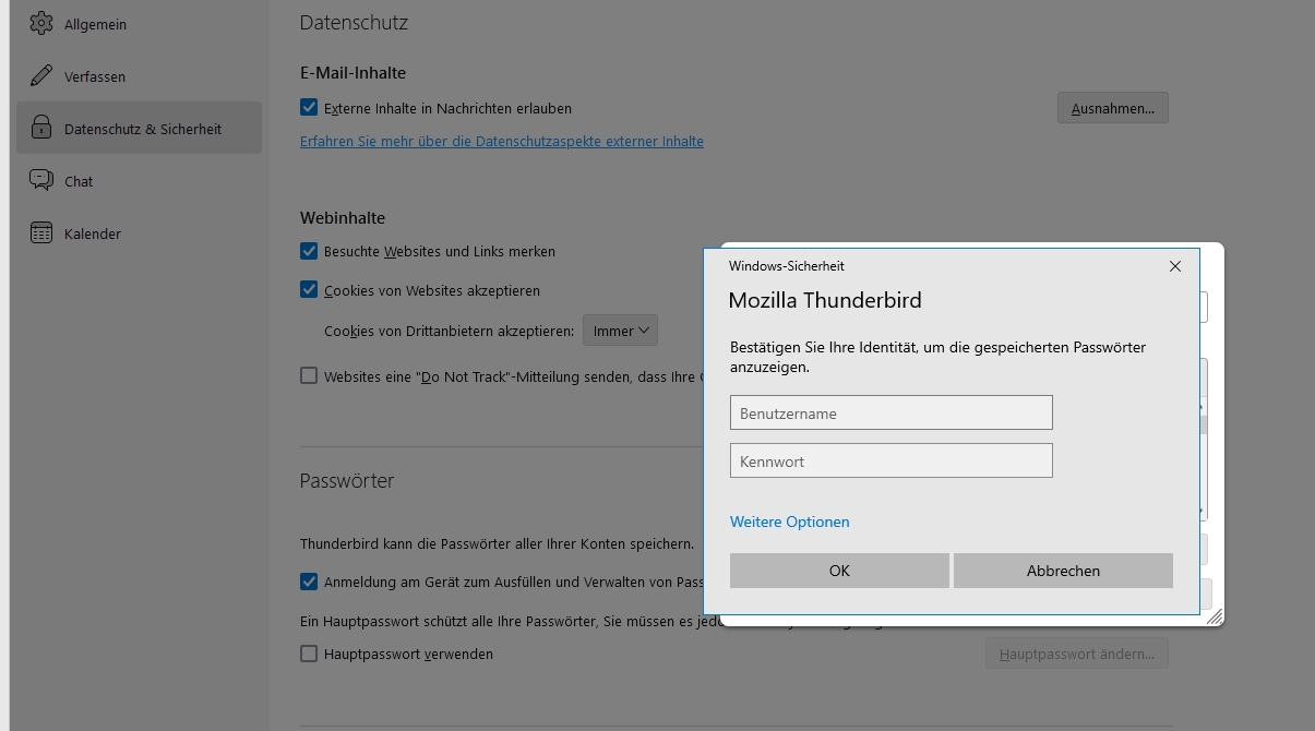 da ich mir all meine Passwörter für die verschiedenen email-Konten ansehen wollte, habe ich über die TB-Einstellungen unter "Datenschutz & Sicherheit", "Passwörter", die "gespeicherten Passwörter" aufrufen wollen (siehe beiliegendes Bild). Um die Passwörter dann direkt in der Popup-Tabelle einfügen und ansehen zu können, wird eine Identitätsprüfung durch "Benutzernamen" und "Kennwort" verlangt (siehe beiliegendes Bild). Mir ist nicht bewusst, dass ich jemals bei TB eine derartige Identität mit Benutzernamen und Kennwort hinterlegt hätte. Mit anderen Worten, ich habe diese beiden Angaben für Benutzernamen und Kennwort nicht.