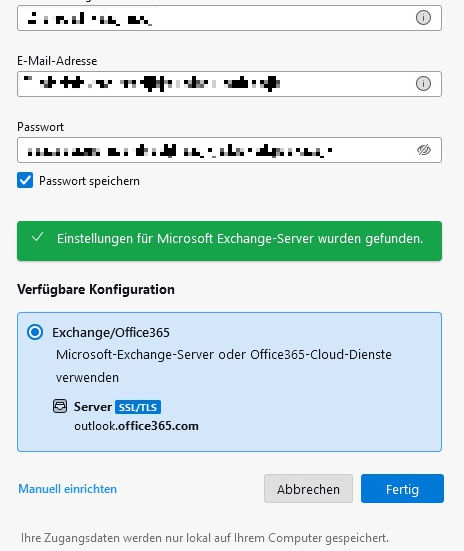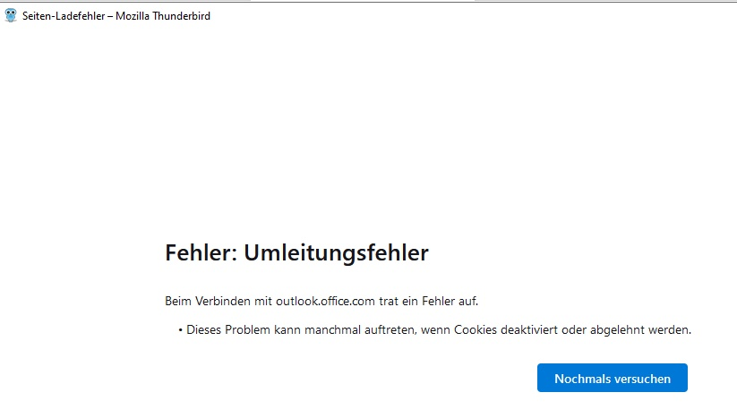 Allerdings habe ich gelesen, dass es jetzt möglich sein sollte, ein Exchange-Konto auch ohne dieses Addon einzurichten. Wenn ich ein neues Konto anlege (Benutzername und E-Mail-Adresse), erkennt Thunderbird zwar, dass es sich um ein Exchange-Konto handelt, aber nach dem Klick auf "Fertig" erscheint ein neues Fenster und kurze Zeit später die Meldung "Fehler: Umleitungsfehler".