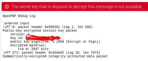 Es wird die rote meldung angezeigt das der notwendige Schlüssel zum entschlüsseln dieser Email nicht vorhanden sei. Ich hoffe mal nicht das ich hier zu viel daten preis gebe. Hinter Key id steht mein privater schlüssel