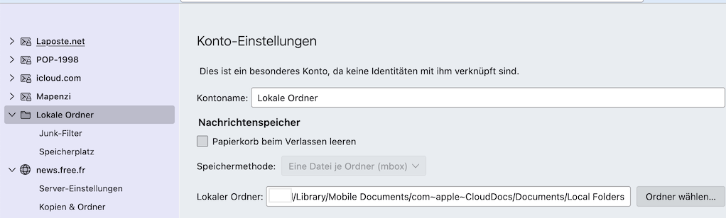 Wenn du die Umbenennung nicht rückgängig machen kannst, schlage ich vor, dass du den Pfad zum "lokalen" Ordner des Nachrichtenspeichers der Lokalen Ordner in der Cloud neu erstellst. Ich habe ebenfalls meine Lokalen Ordner in einer Cloud gespeichert: