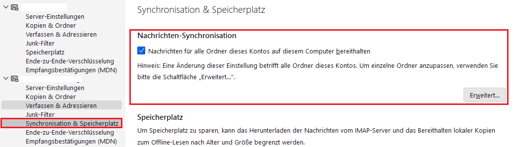 Von Ihnen angezeigte Nachrichten, die nicht auf Ihrem Computer gespeichert sind, werden normalerweise in einem speziellen Cache-Ordner gespeichert. Dadurch können sie schneller angezeigt werden, wenn Sie diese Nachrichten später erneut ansehen möchten. Hier legen Sie die Größe des Speicherplatzes für den Cache fest. Sie können den Inhalt des Cache auch sofort löschen.