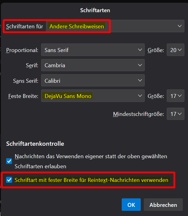 ACHTUNG: Die Auswahl einer Schriftart mit fester Breite muss grundsätzlich für die Zeichensätze UTF-8 ("andere Schreibweisen") und mindestens Lateinisch (iso) vorgenommen werden! Auch müssen bzw. sollten alle Einträge in den folgenden Menüs immer gleich sein!![]()