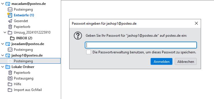 1. Wenn ich sie aufrufe, wird ein Passwort verlangt. Das PW für das Posteo-Hauptkonto geht hier nicht. Weiter komme ich nicht.