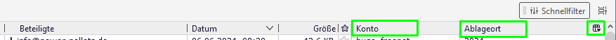 Dort das Menü Anzuzeigende Spalten auswählen öffnen und Konto und Ablageort aktivieren, siehe Markierung auf dem Screenshot.