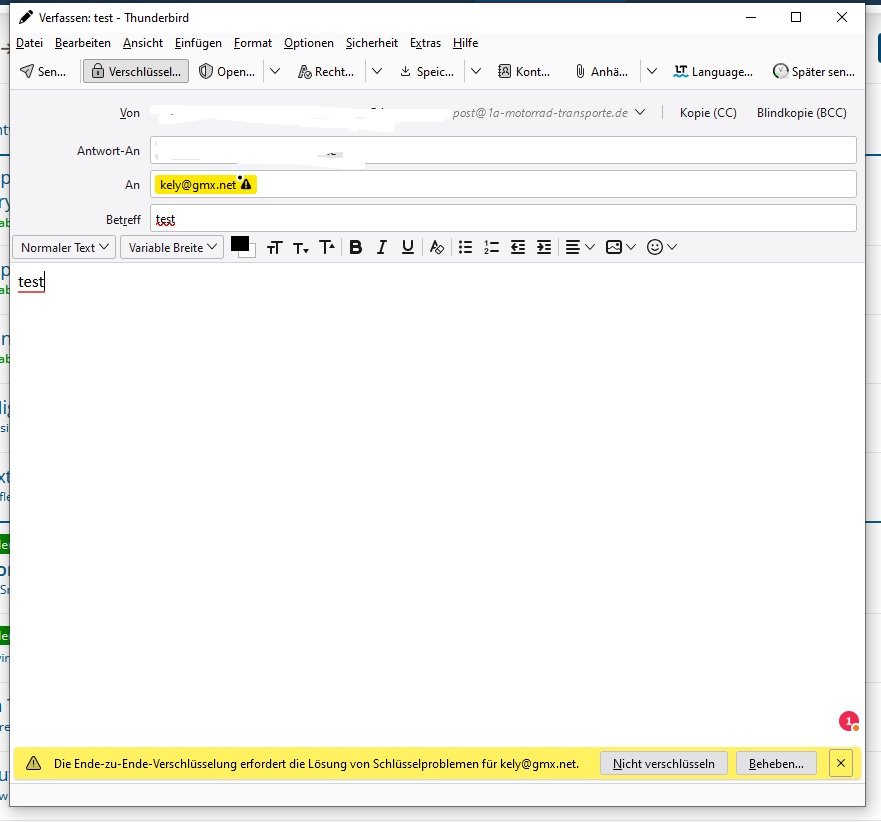 Wenn ich jetzt eine Mail schreibe und diese verschlüsseln möchte wird mir ein Fehler angezeigt, siehe Bild.