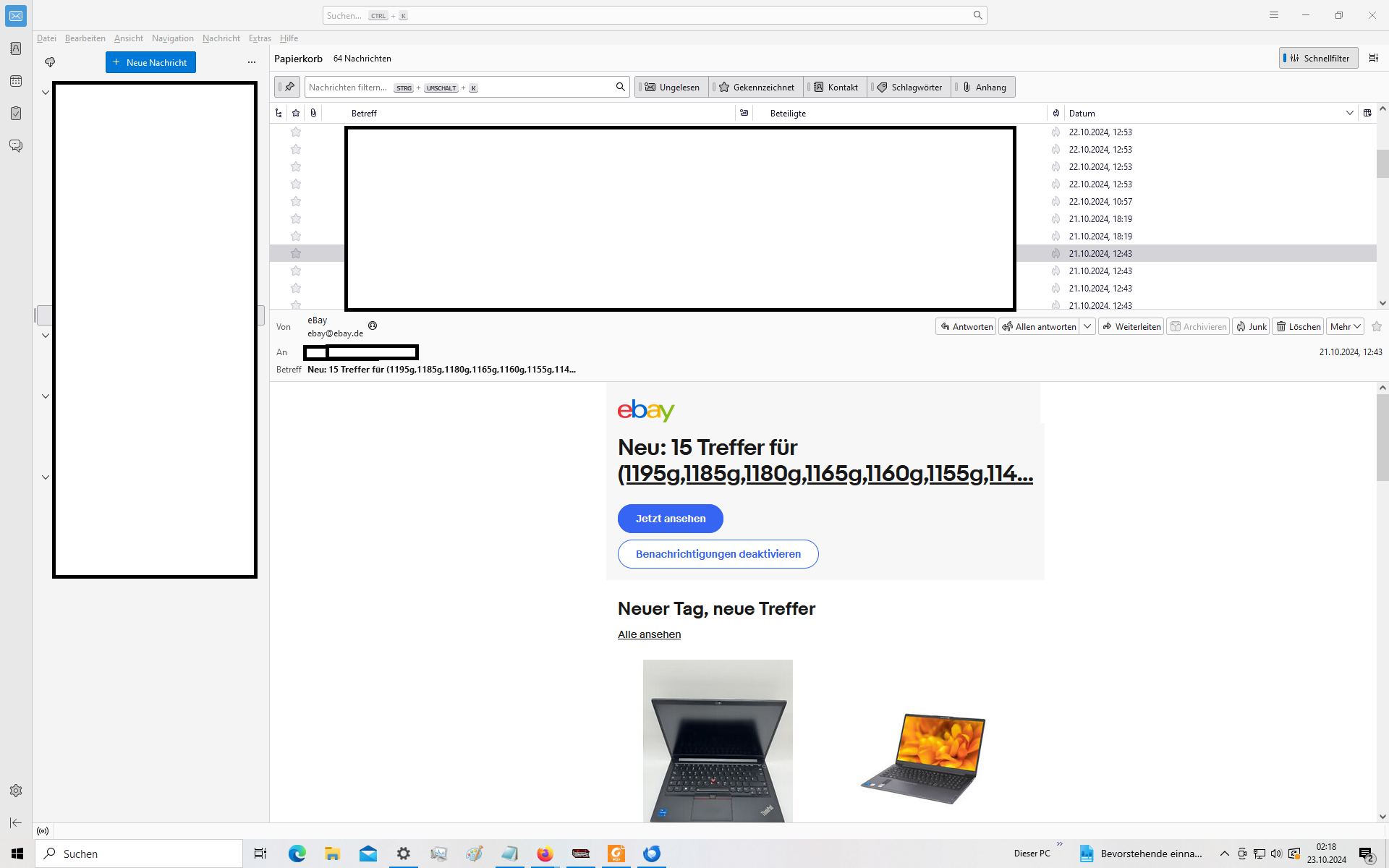 Kann man da was machen in Thunderbird, oder muß man sich damit abfinden oder etwa bei Ebay nach einer Lösung fragen? (bei Ebay- Benachrichtigungen zu neuen Angeboten für eine Suche).