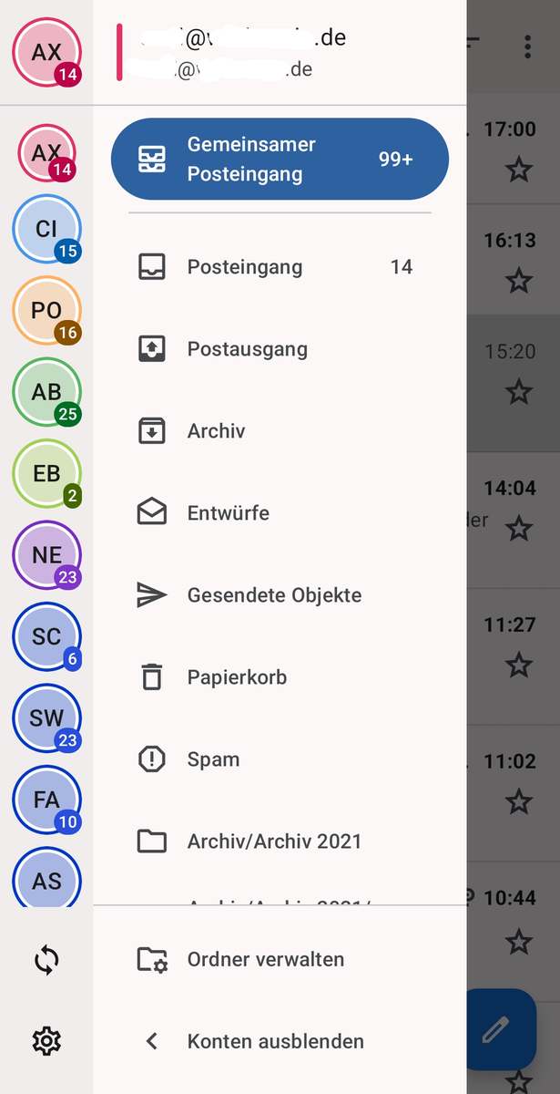 Hallo, ich habe aktuell auch TB 9.0 Android installiert, und fand die Kontoauswahl in K-9 Mail (letzte die ich installiert hatte war 8.0b3) besser. Wenn vorhanden Profilbild sowie Mailadresse und Kontenname.