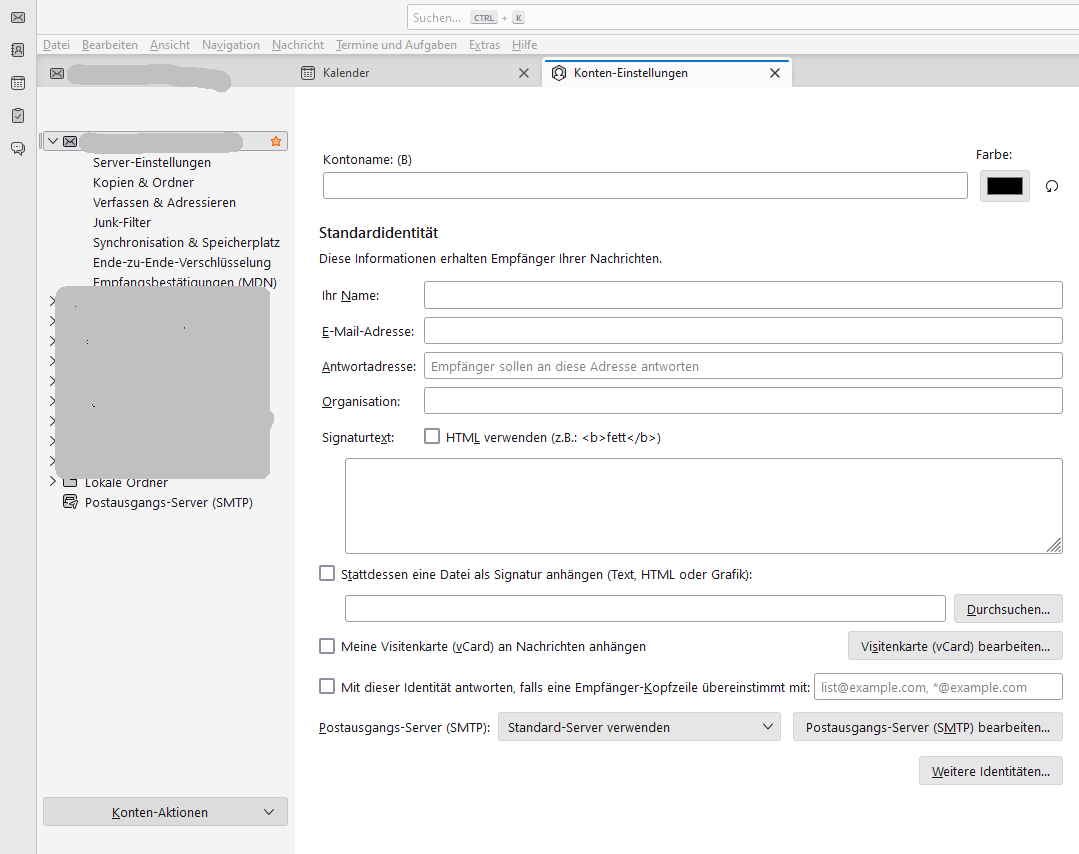 seit 128.x.x.esr sind die Felder bei den "Konto-Einstellungen" komplett leer. Und zwar bei allen angelegten Mailacconts.