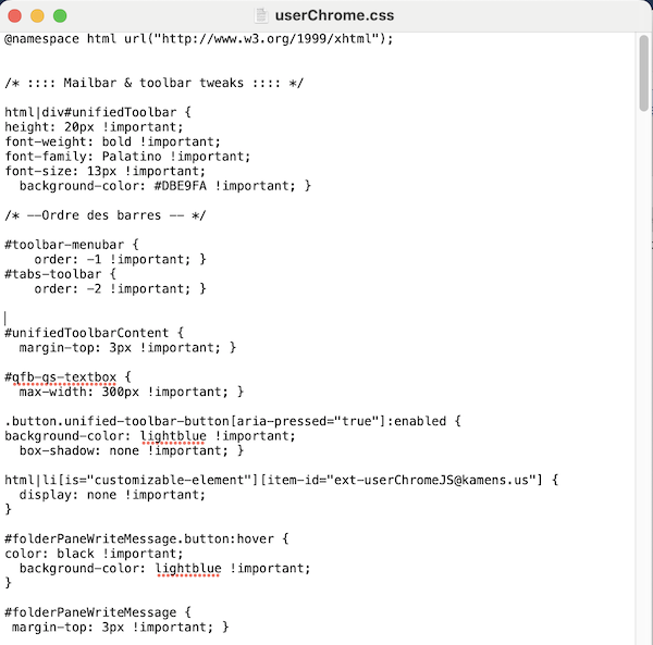 https://github.com/Endor8/userChr…r/Firefox%20128Nein, da geht es um Javascript, wie das Kürzel .js schon verrät. Das ist was komplett Anderes als .css (CascadingStyleSheet).