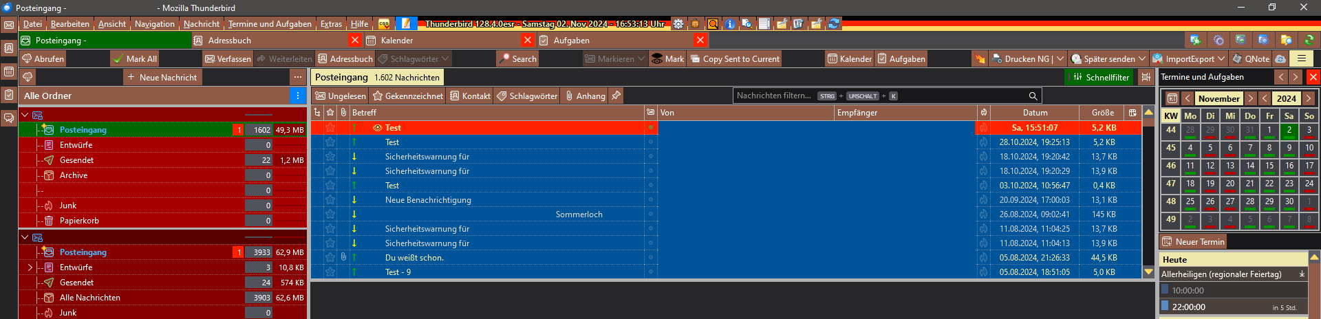 Da erschien das Postfach tatsächlich in roter Farbe und der Spam-Ordner (in dem auch 2 neue Mails drin waren), erschien in oranger Farbe.