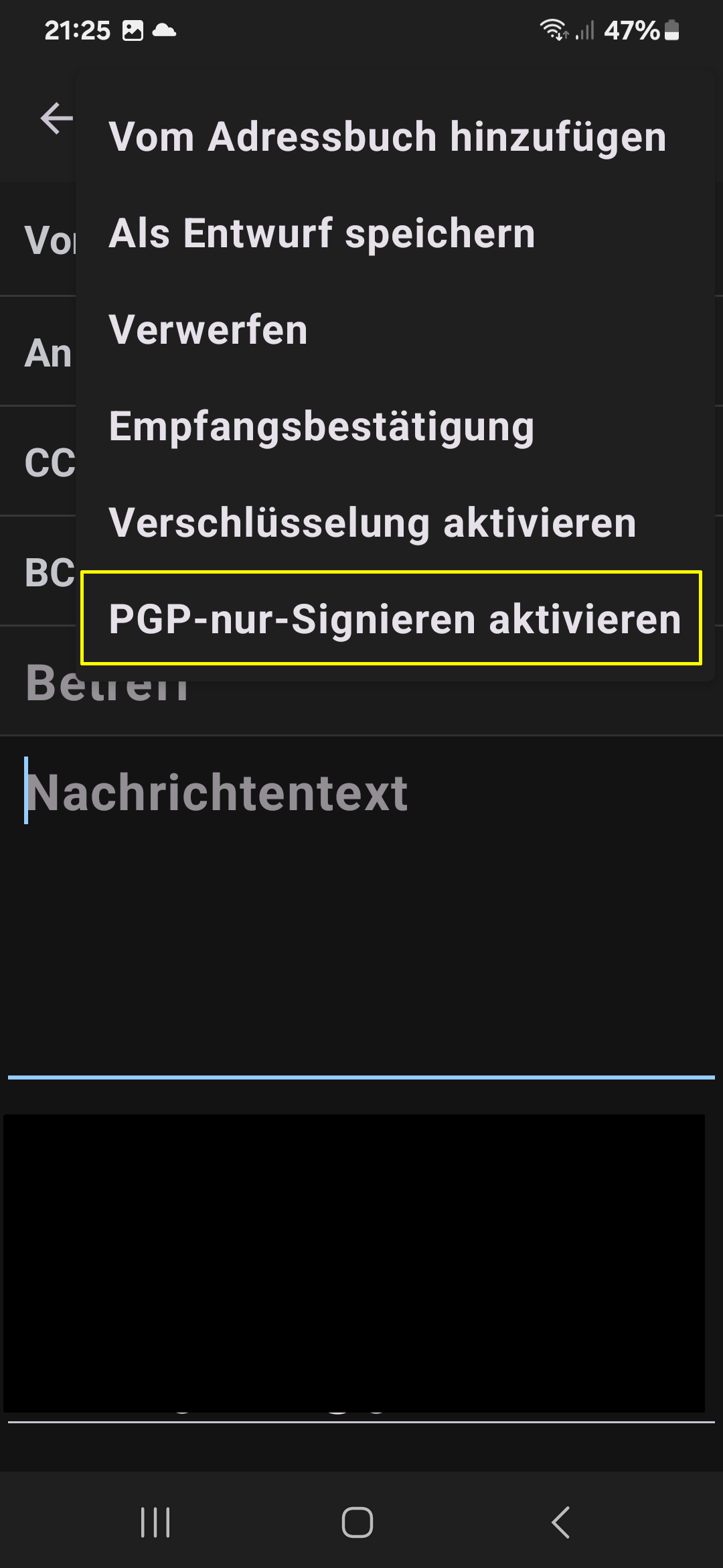 Grundsätzlich signiere ich meine ausgehenden E-Mails mit einem OpenPGP-Zertifikat. Diese habe ich auf dem Smartphone per OpenKeychain eingebunden. Die Frage ist nun: wie signiere ich die ausgehenden E-Mails? Oder sehe ich das richtig, dass Mail nur verschlüsselt werden können?