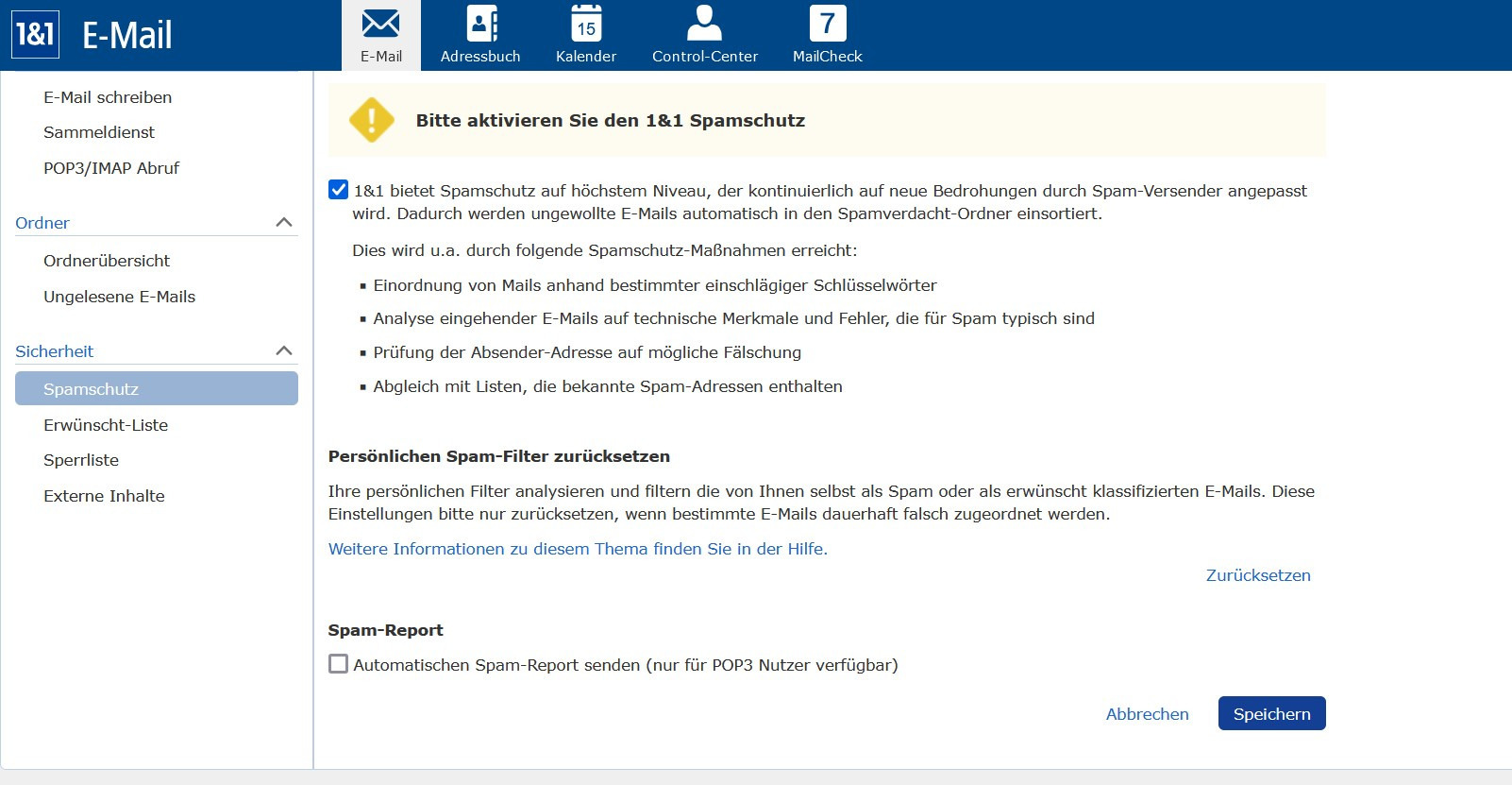 Aktuell bin ich täglich mehrmals gezwungen, im 1&1-Webmailer den Spamordner zu kontrollieren, dort von 1&1 zugeordnete Spammails wieder in den Posteingang zu verschieben, damit diese dann über das POP3-Verfahren an meinen Betterbird weitergeleitet werden. Auch ist es schon passiert, dass reguläre Mails von 1&1 als Spam deklariert wurden und ich deshalb diese nicht bekommen habe.